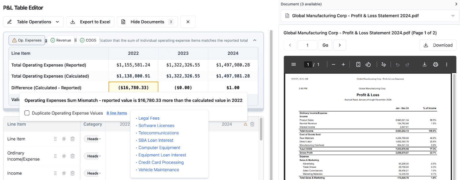You can view source documents (including Excel files) live in the app, do side-by-side comparisons, and export a clean, reconciled P&L ready for modeling or further analysis.