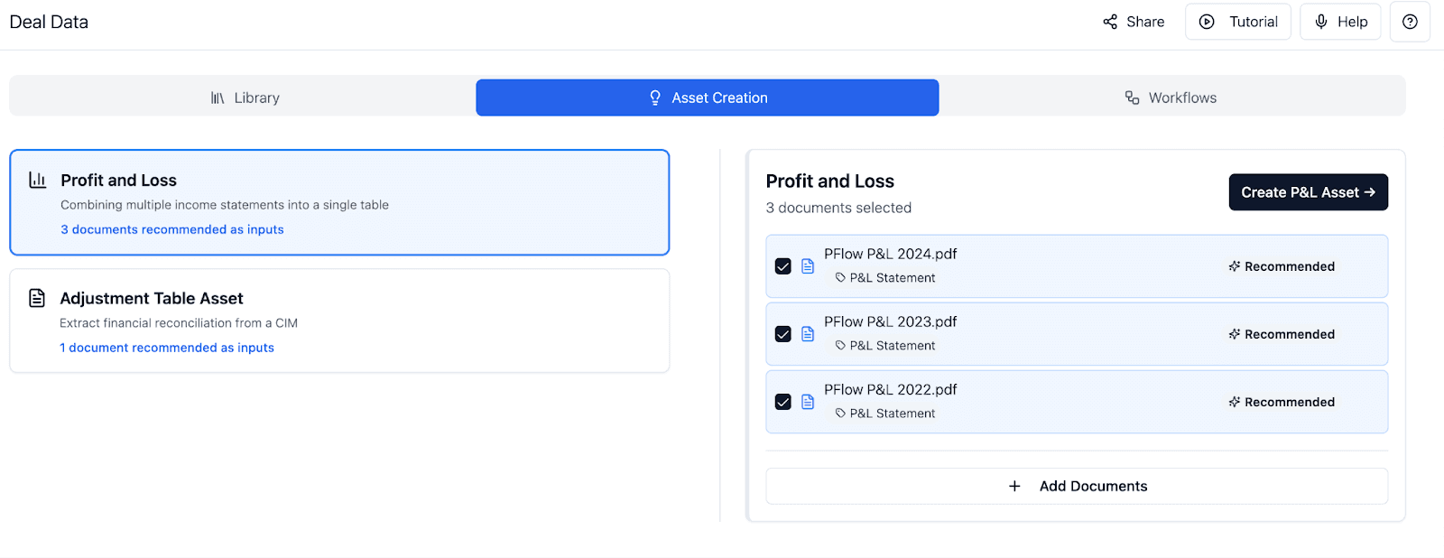 Deal Assets are specifically designed for complex financial data requiring precision. For simple table extraction from CIMs and marketing materials, use Data Tables. For messy owner-provided P&Ls, QuickBooks exports, and detailed financial statements, always use Deal Assets.