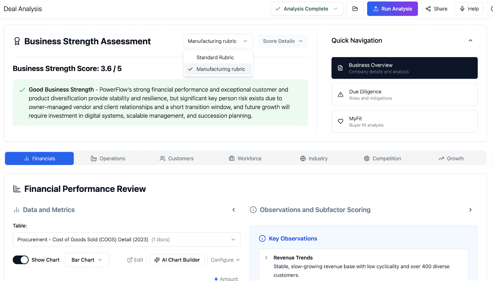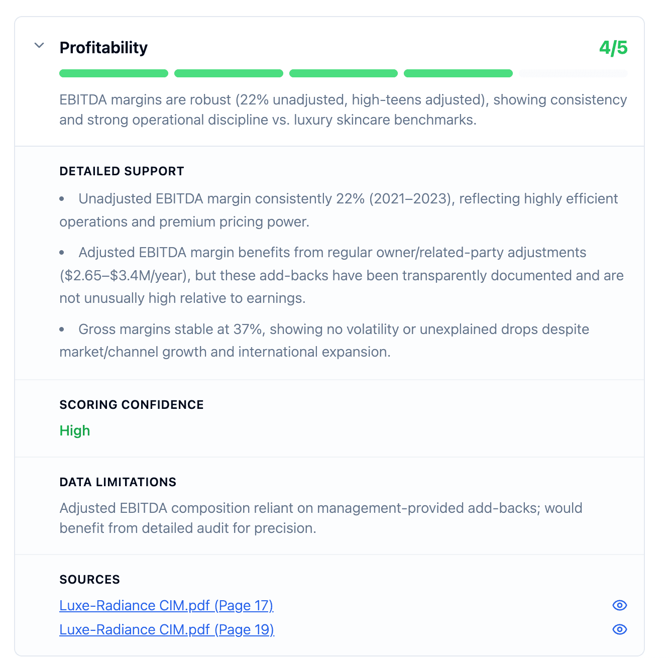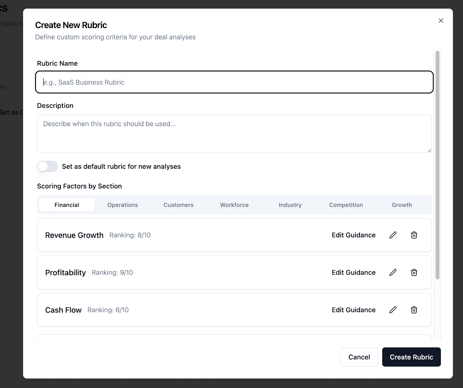 Custom Scoring Rubrics let you define your investment criteria once, then apply them consistently to every deal—screening 60-page CIMs in minutes instead of spending 2 hours hoping you didn't miss something critical.