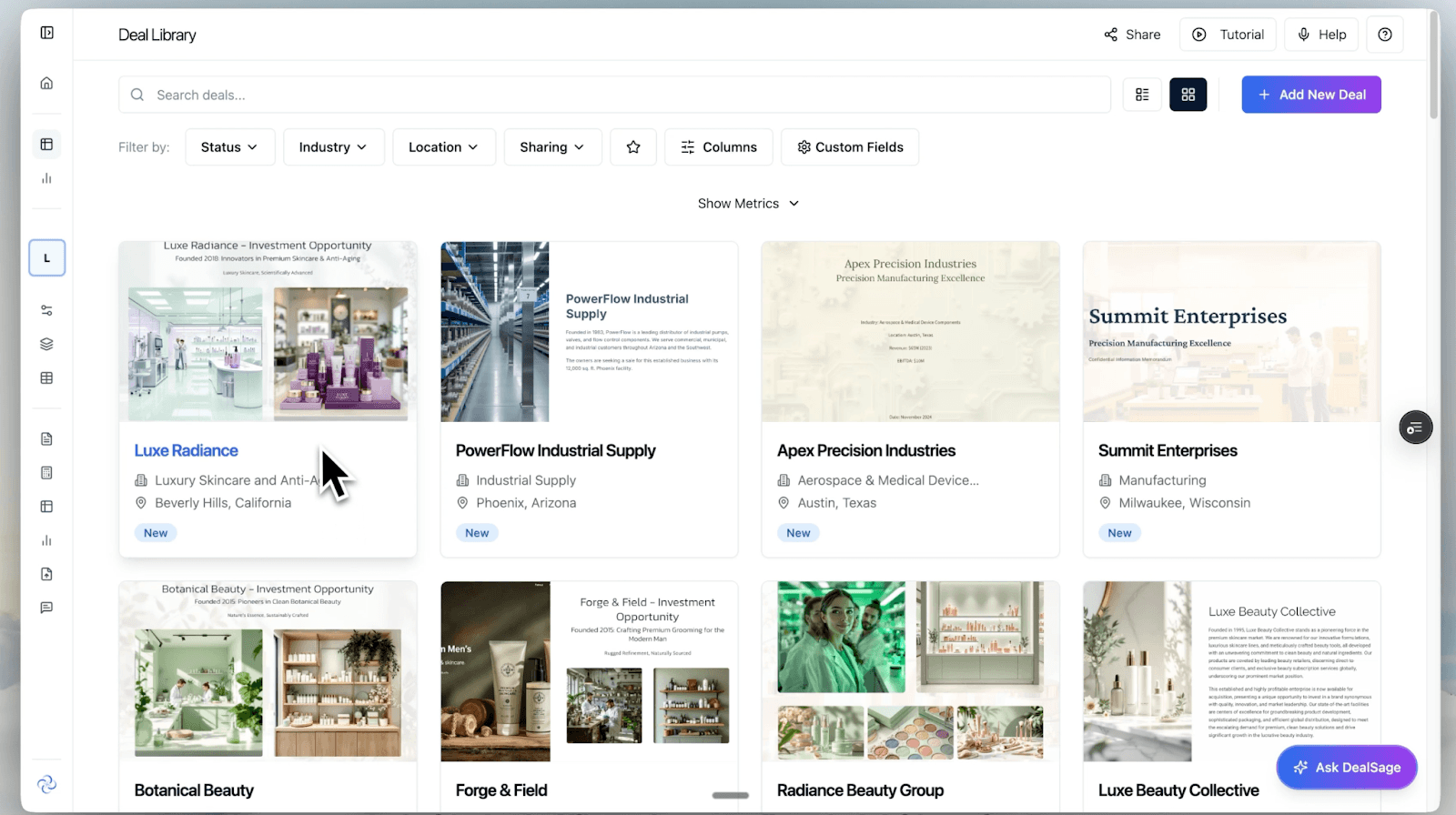 Inside the deal library, I can see all my deals laid out visually. I open Luxe Radiance and all the key details are already filled in automatically.