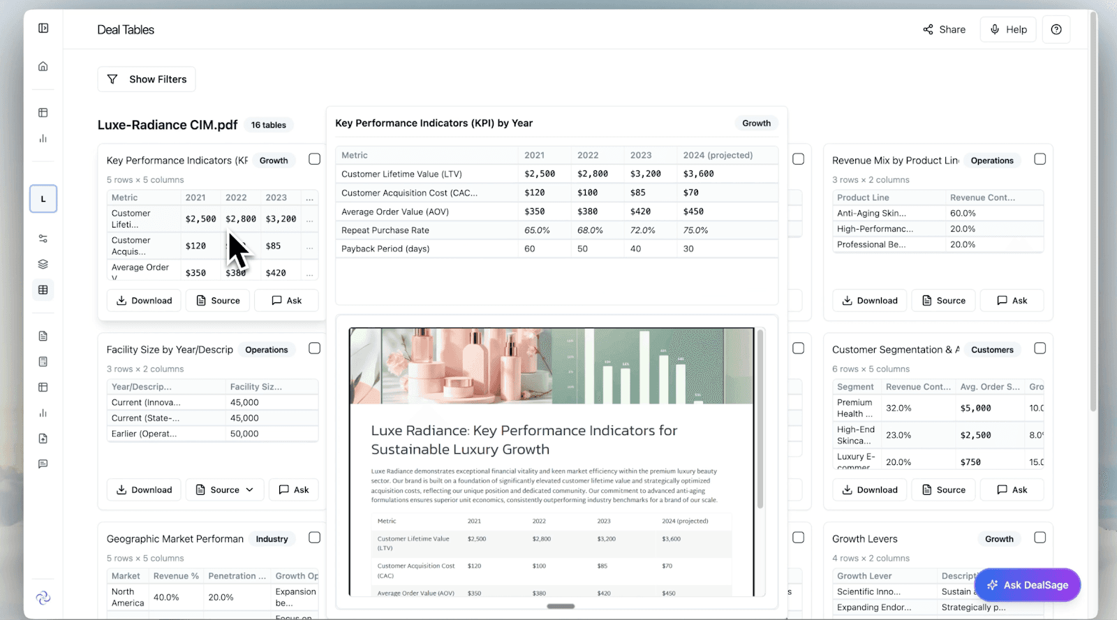 In Deal Tables, DealSage has already extracted and structured every relevant table and metric from the CIM into a clean, usable database. Everything is sourced, so I can always trace any number back to exactly where it came from in the original document.