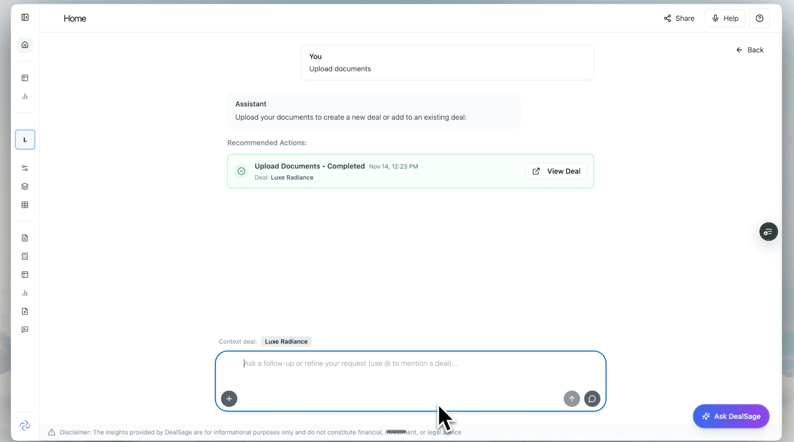 As soon as I upload, DealSage creates the deal entry and immediately begins extracting and structuring all the underlying data. No waiting, no manual tagging.