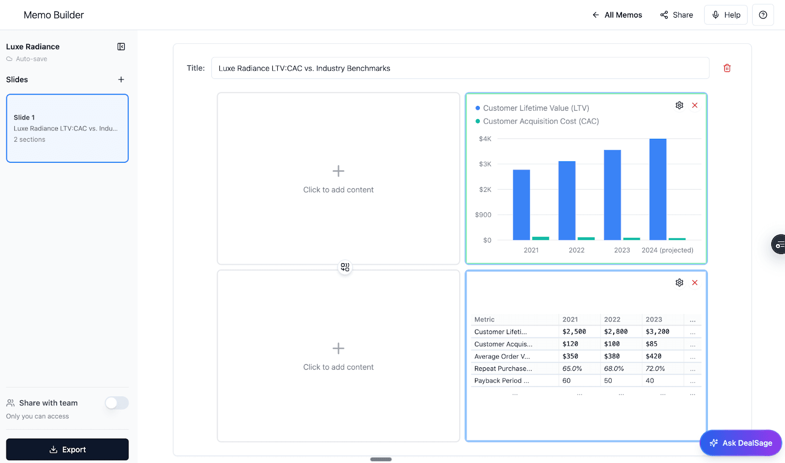 Start with DealSage templates for common memo structures, then edit and refine to match your firm's style. Create multiple slides for different sections: executive summary slide, financial analysis slide, benchmark comparison slide. Save your customized layouts for reuse across similar deals. Consistency makes IC review faster and more effective.