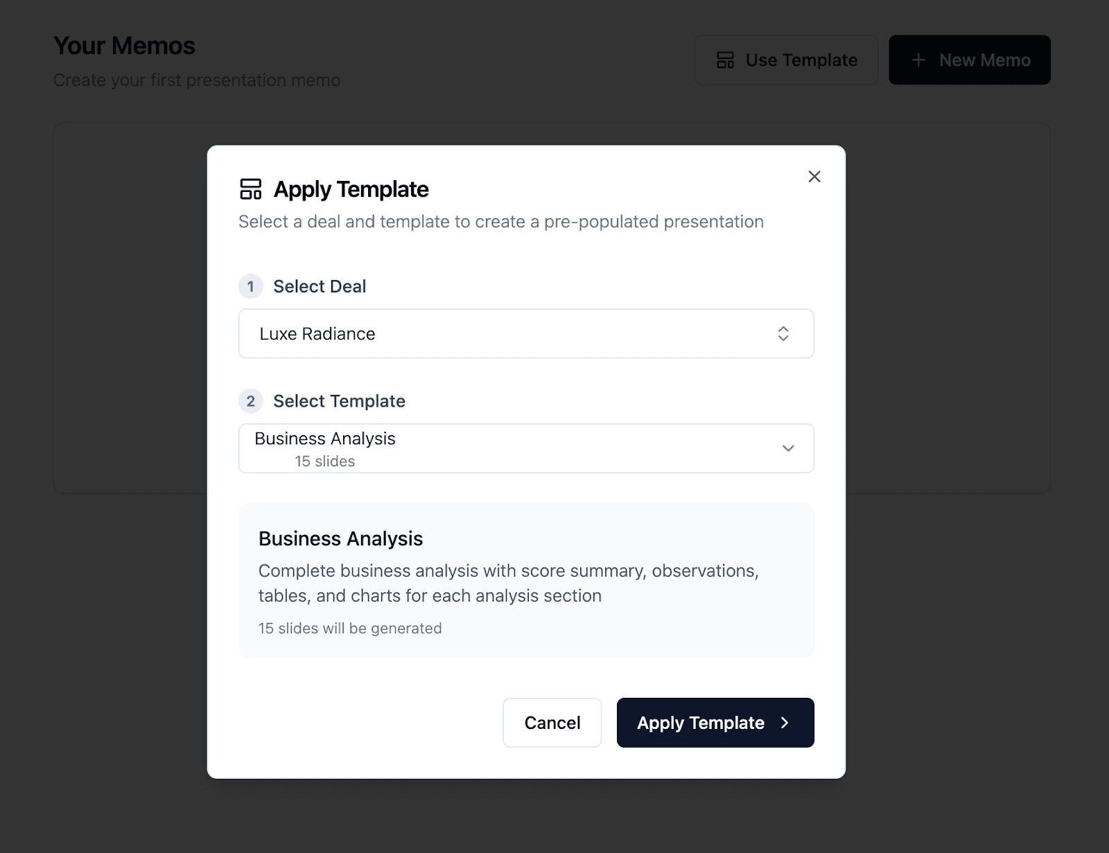 Here's what happens: Use DealSage's memo builder to create your presentation in a flexible grid format. Select what inputs you want to include: tables, charts, text blocks. Pull in your business analysis and scoring results. Choose from templates, edit and refine your layout, create multiple slides, and export to PowerPoint.