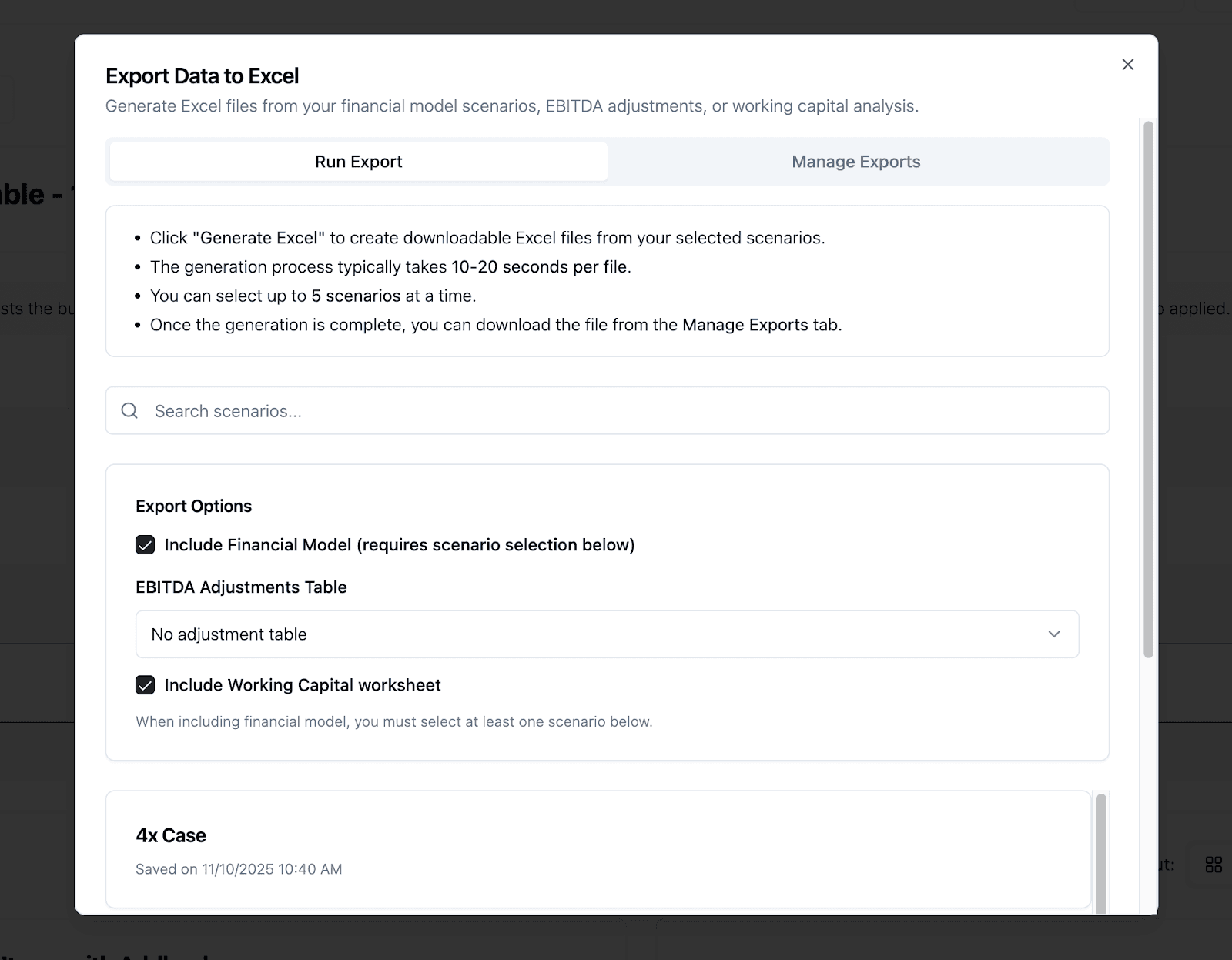 Your EBITDA reconciliation, financial projections, sensitivity analyses—all exportable to Excel with formulas and cell linkages intact. No copy-paste. No rebuilding formulas. Just working Excel models that plug into your existing underwriting process.